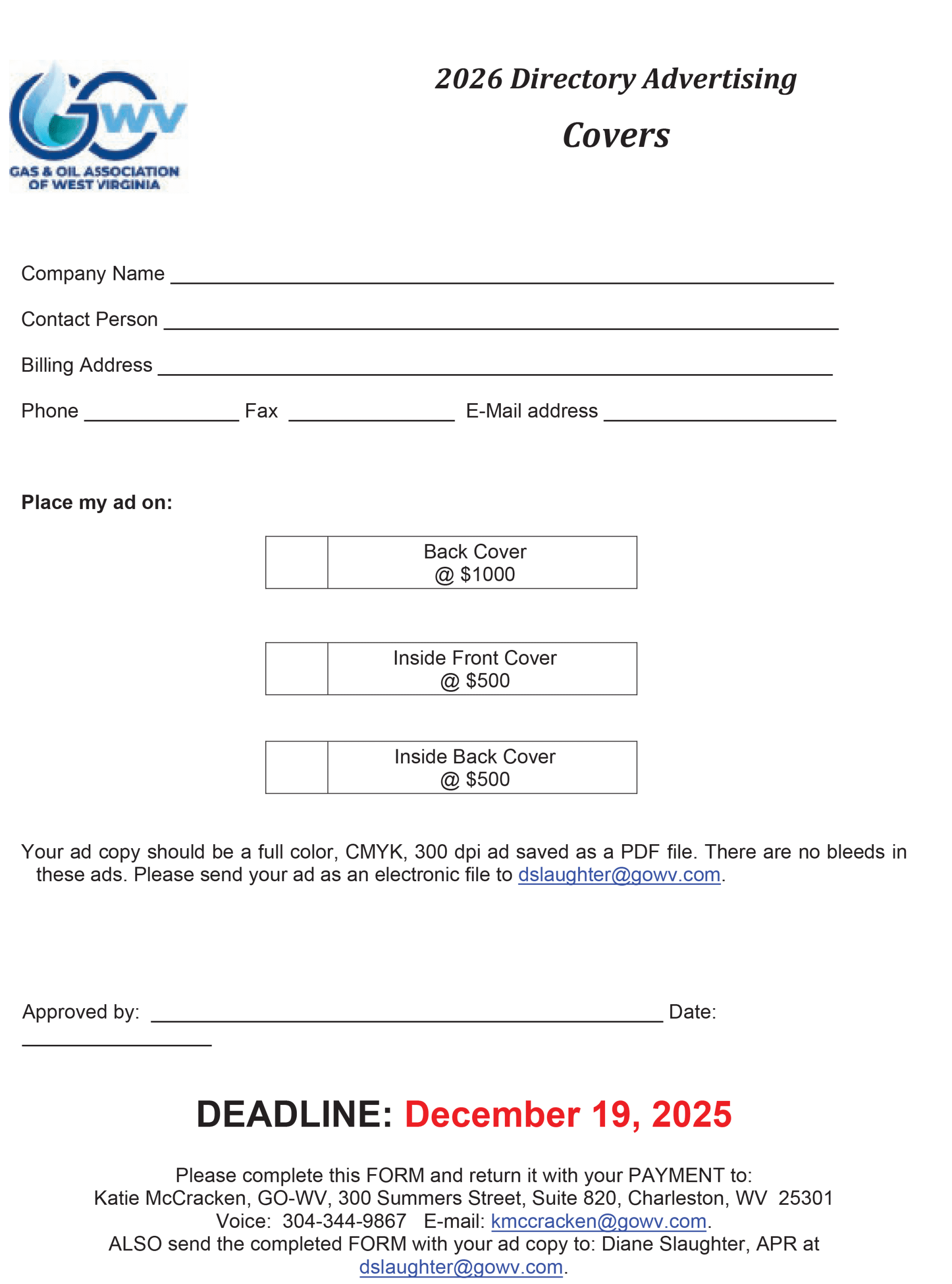 In order to have an ad, we must receive your completed form(s), high resolution ad copy and your payment in the appropriate amount no later than December 19, 2025. If you have any questions, please contact Diane Slaughter at (304) 984-0308 or via e-mail at dslaughter@gowv.com.