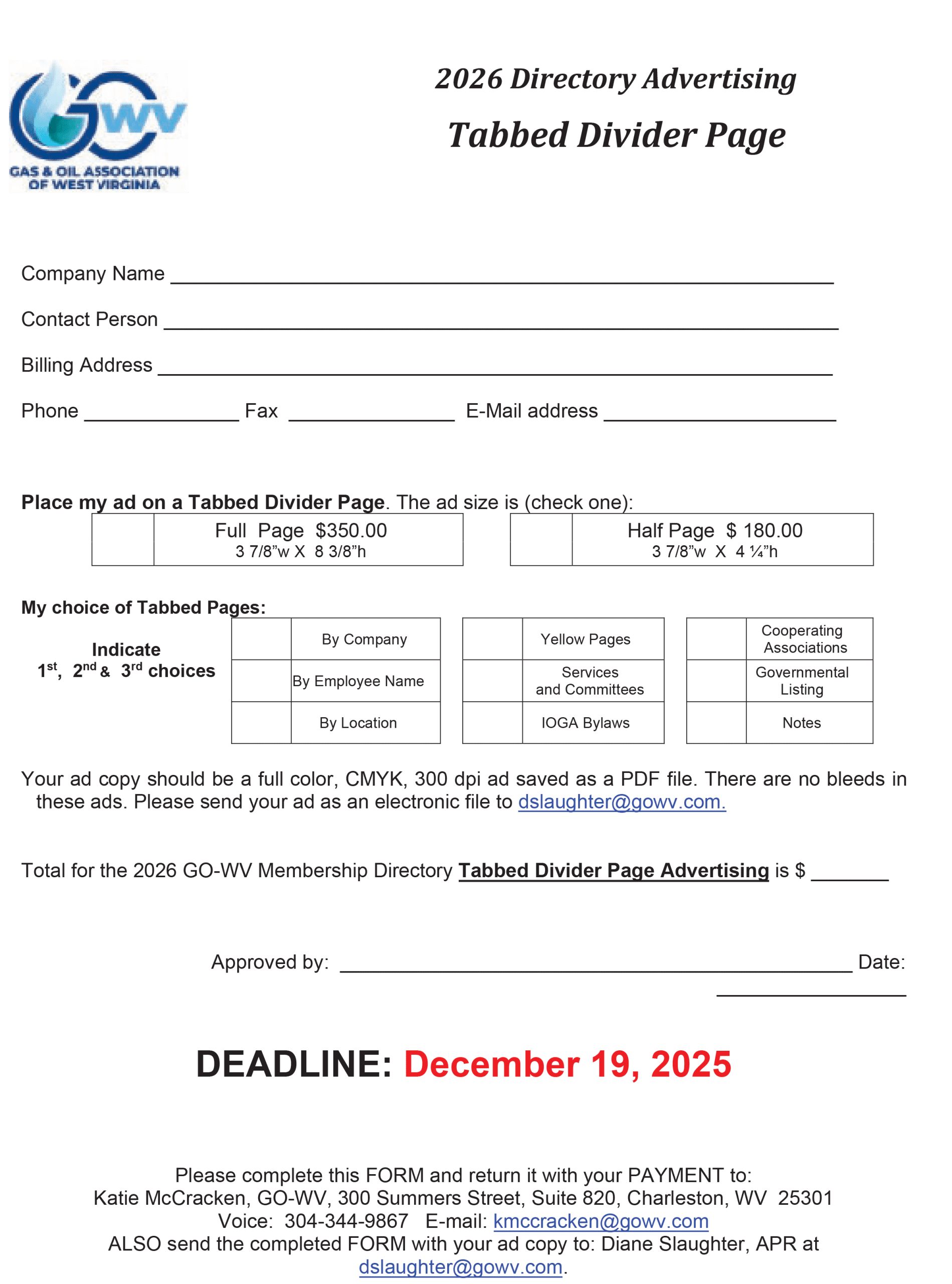 - Your first option is to place your advertisement on one of the tabbed page dividers. These pages are limited and will be available on a first-come, first-served basis. Ads will be sold on both sides of each tabbed page. Please make your selection from the following membership category: by Company, by Employee Name, by Location, Yellow Pages, Services and Committees, GO-WV Bylaws, Cooperating Industry Associations, Governmental Listing or Notes. When making your selection, please indicate your first, second and third choice on the Tabbed Divider Page Advertisement form. Return the form with your high resolution (minimum 300 dpi) color ad copy. Note that ads on these pages will only be available in full and half page sizes and are in color. Again, the corresponding rates are identified on the attached form.